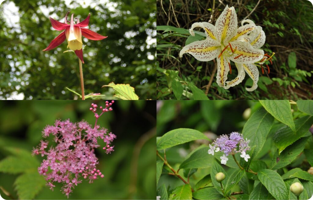 6月の終わり、登山道脇にヤマオダマキが咲き始め、盛夏の頃まで楽しめます。7月、大輪の白い花ヤマユリが一服の涼を与えてくれます。7月から8月にかけて、表丹沢の稜線部ではシモツケソウが淡紅色の花を花火のように咲かせます。沢沿いなどでは、球形の蕾が特徴のタマアジサイが咲き始め、秋の訪れまで目を楽しませてくれます。