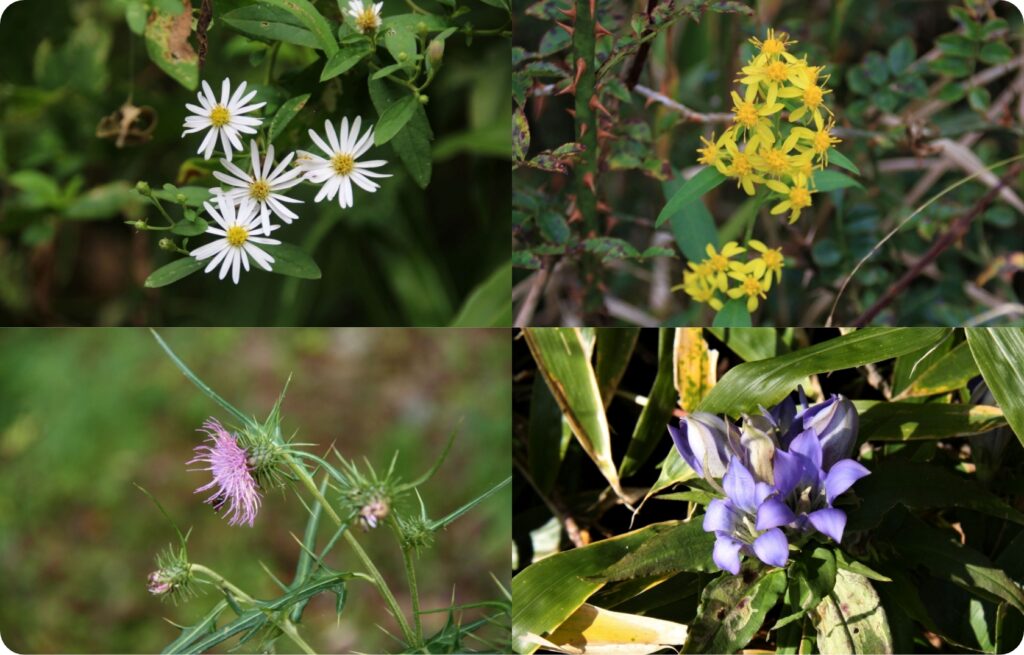 秋は様々な菊の仲間が咲き誇ります。9月頃、山野の日当たりのいいところに咲くノコンギク。白い花の野菊の仲間は他にタテヤマギクやシロヨメナ、リュウノウギクなどがあります。黄色い花はアキノキリンソウ。多数の花を付けます。山麓から稜線部まで広い範囲に咲くタイアザミは11月頃まで楽しむことができます。登山道を彩るリンドウは、9月から11月頃まで咲いています。