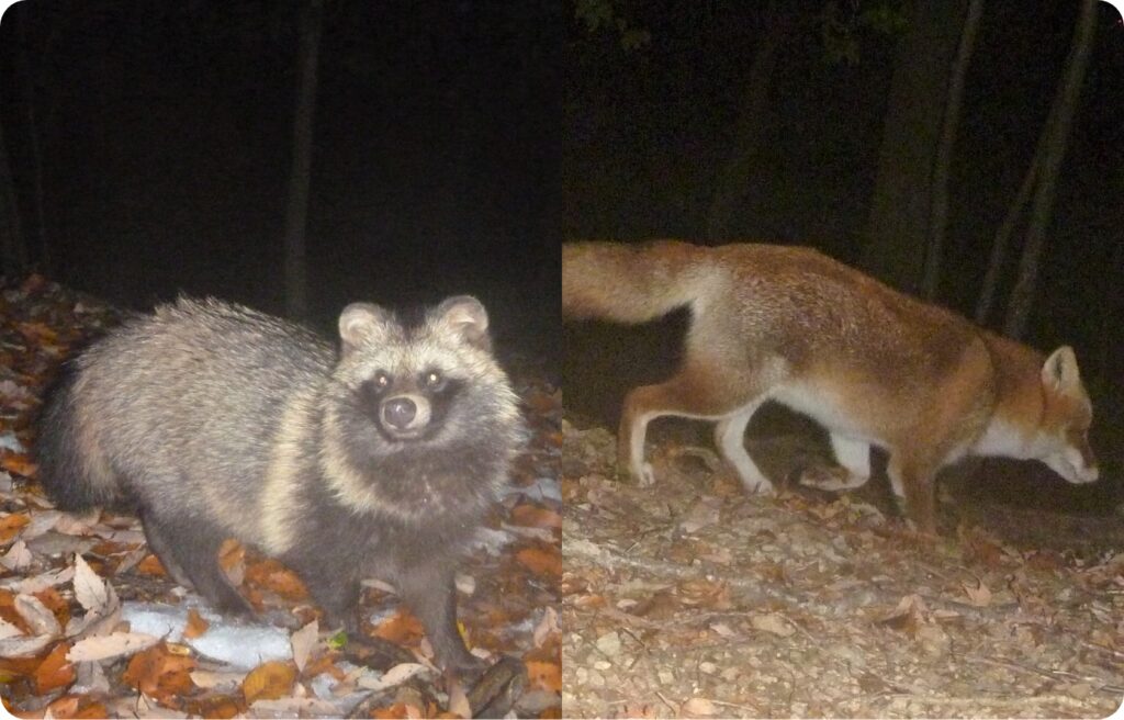 昔話でおなじみのタヌキとキツネも表丹沢の森に暮らしていますが、なかなか出会う機会はありません。特にキツネはめったに出会えない存在です。足跡や糞などの痕跡から存在を確認することが多い生き物です。