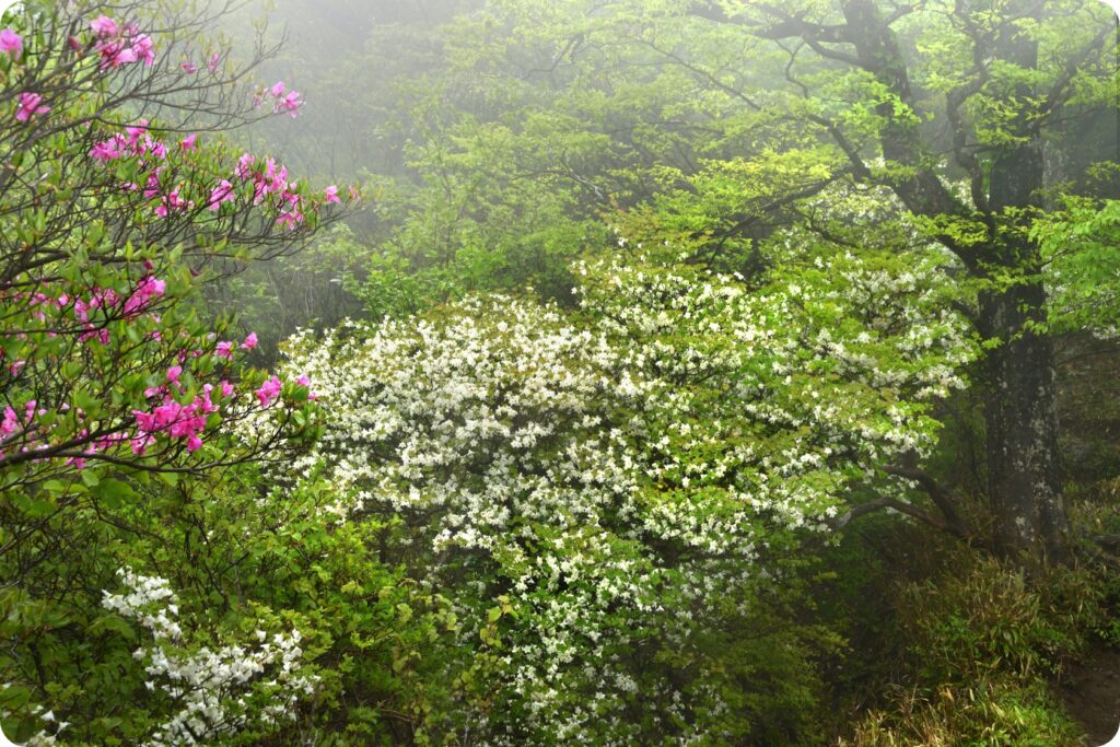 まだ肌寒い3月頃、山麓では瑠璃色のヤマルリソウが咲き始め、春の訪れを告げます。目線に近い高さには、神楽を舞っているように見えるピンク色のウグイスカグラが咲いているかもしれません。4月、林縁をヤマブキがその名のとおり山吹色に染めます。5月、表丹沢の稜線近くでは、登山者が登山の目的にするほど人気のシロヤシオが白い花を咲かせます。