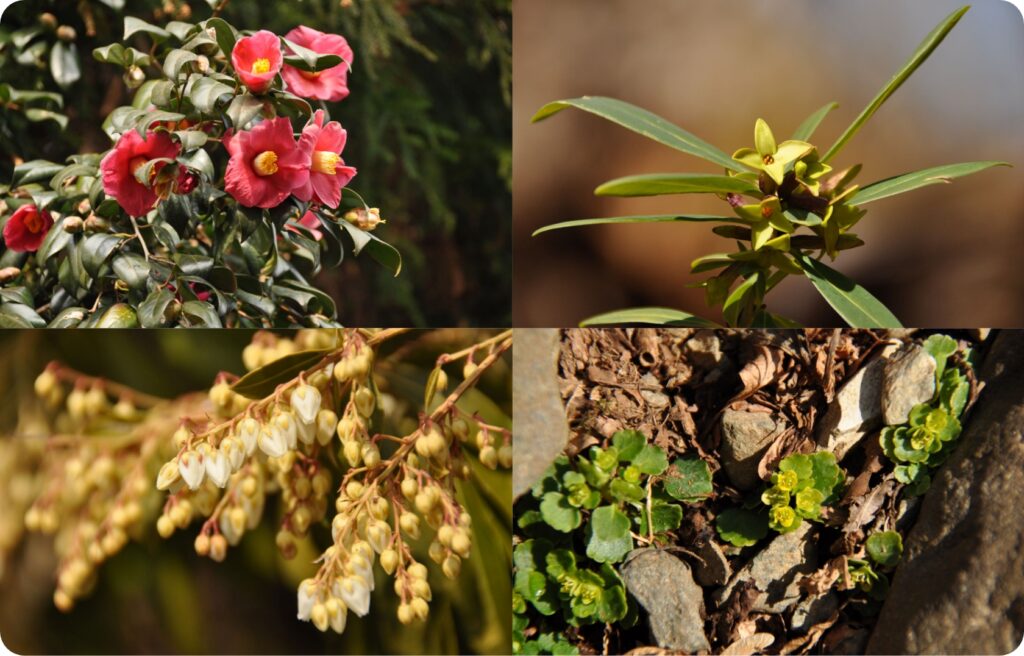冬枯れの森に紅色の花を咲かせるヤブツバキは12月頃から咲き始め、春まで、そこかしこで咲いています。花が乏しい2月頃から咲き始めるオニシバリやアセビも標高が上がるとともに春まで楽しむことが出来ます。2月の終わり、緑色の葉が地面に色を添えるムカゴネコノメをよく見ると、中心に黄色い花を咲かせています。ネコノメソウの仲間は、早春の代名詞です。