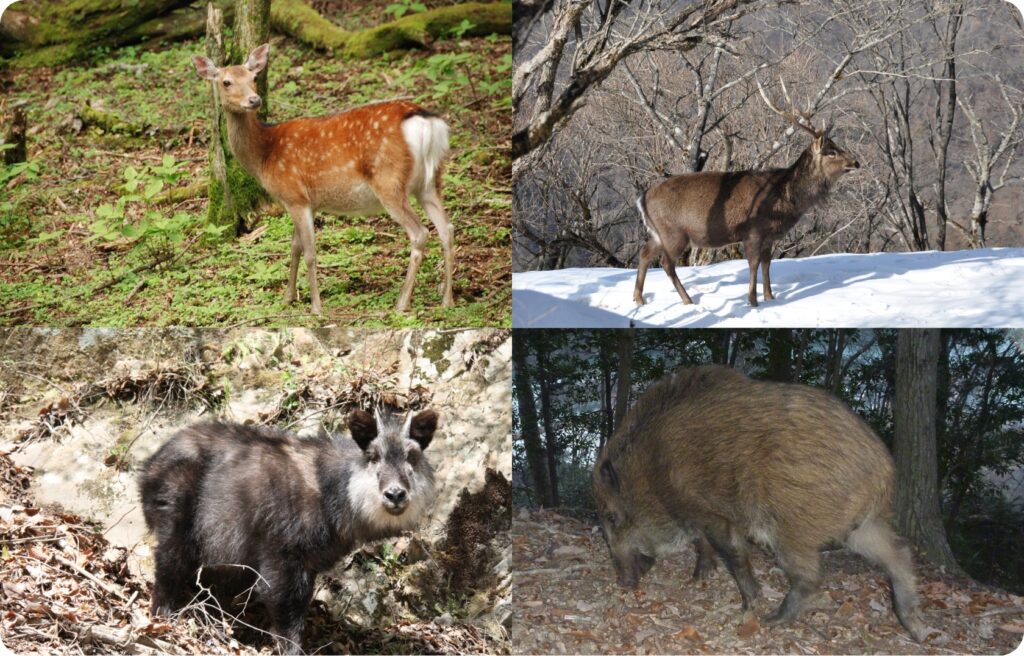 表丹沢でよく出会える動物はニホンジカです。オスもメスも、夏毛は鹿の子模様に生え変わり、冬毛は灰褐色になります。角があるのはオスのみです。運が良ければ出会えるのはカモシカで、崖の上などからそっとこちらを覗いているかもしれません。警戒心が強く出会う機会が少ないのはイノシシです。登山道脇の土を掘り起こしたり、ここを通ったよ、という証拠が見つかります。