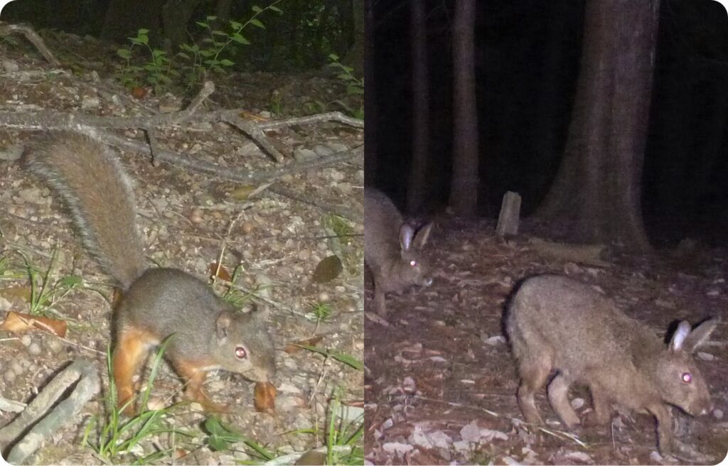 アカマツやオニグルミの多い森の中、運が良ければ昼行性のニホンリスに出会えるかもしれません。松ぼっくりやクルミの種子が大好物です。草原の減少とともに出会う機会は減りましたが、ノウサギも生息しています。背丈の短いササの葉をナイフで切ったような食べ痕が見つかるかもしれません。