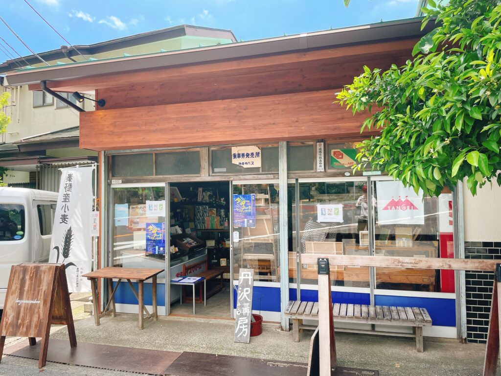 「丹沢講房」で購入したお菓子をもってプチピクニック。ベンチに座って、相模湾を眺めながらゆったりできます。秋はもみじの景色も楽しめます。